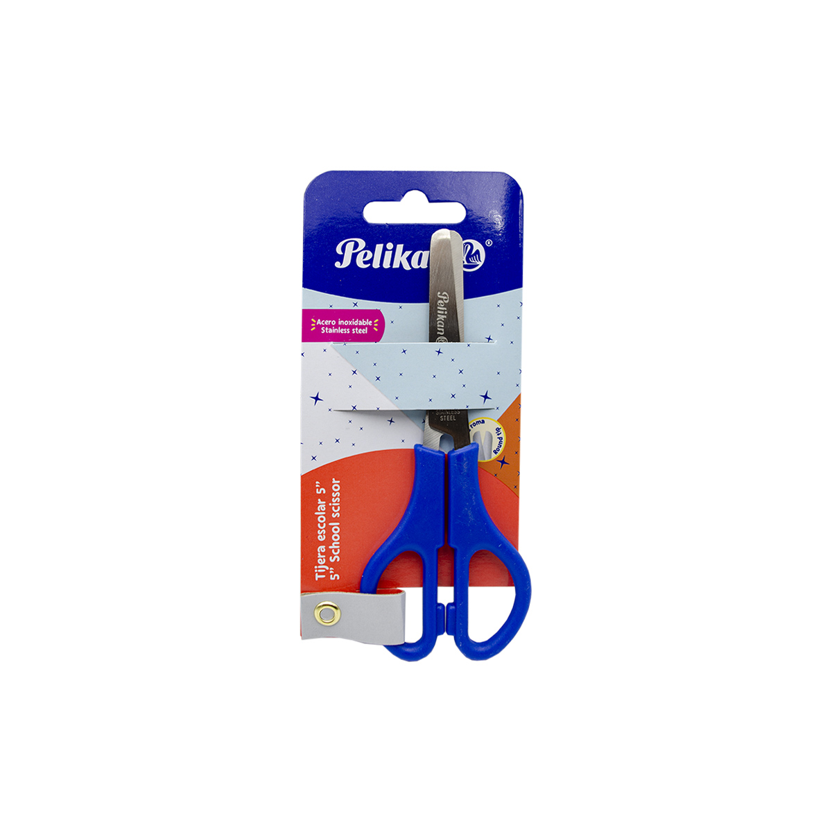 Tijera escolar con punta roma y mango de plástico. 5″. Ideal para uso escolar. Presentación en blister con 1 pieza.