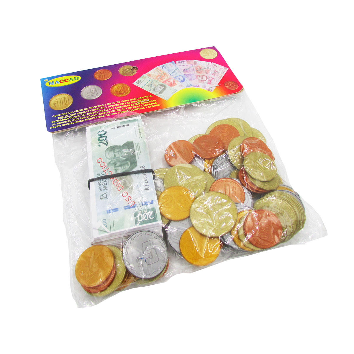 Juego Didáctico Maccad Billetes y Monedas. Contiene un juego de monedas y billetes para uso didáctico, con el que podrás conocer y aprender las diferentes denominaciones del dinero real. las monedas están grabadas al reverso con su equivalencia entre sí, con esto lograras hacer operaciones monetarias de una forma divertida y segura. ¡Para desarrollar la motricidad fina en los niños de preescolar!