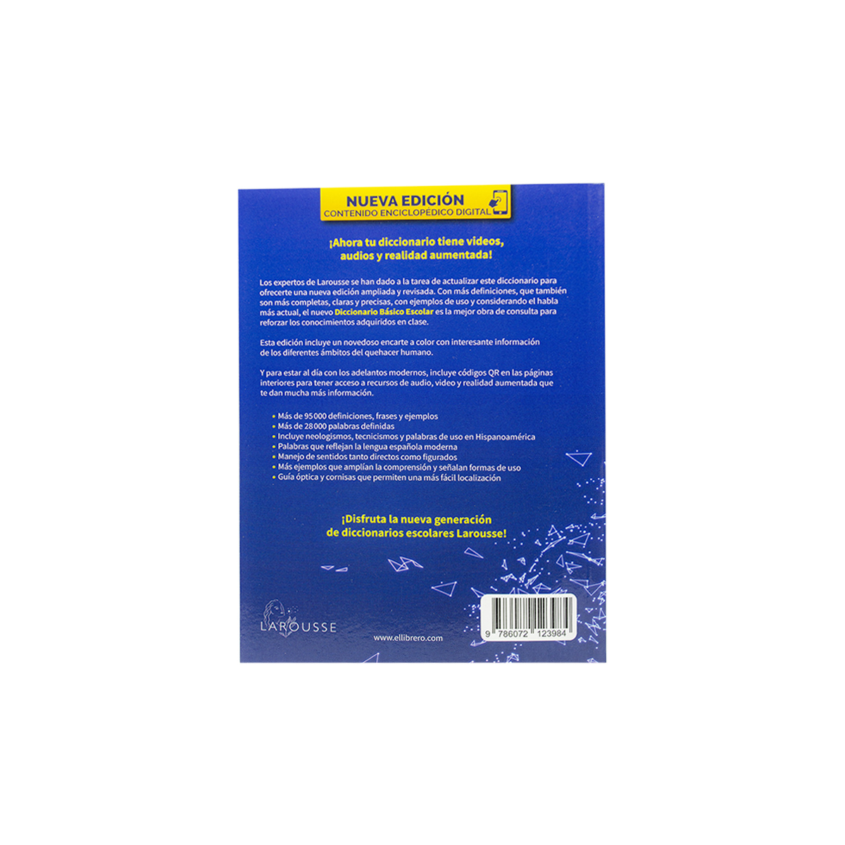 Diccionario Larousse Básico Escolar. Auxiliar educativo: escrito y diseñado para los estudiantes que se inician en la consulta de un diccionario. Ideal para niveles de educación básica. Más de 90,000 definiciones, frases y ejemplos. Más de 27,000 palabras definidas. Guía óptica y cornisas que permiten una más fácil localización. 40 páginas a todo color que incluyen una sección sobre vida sana.